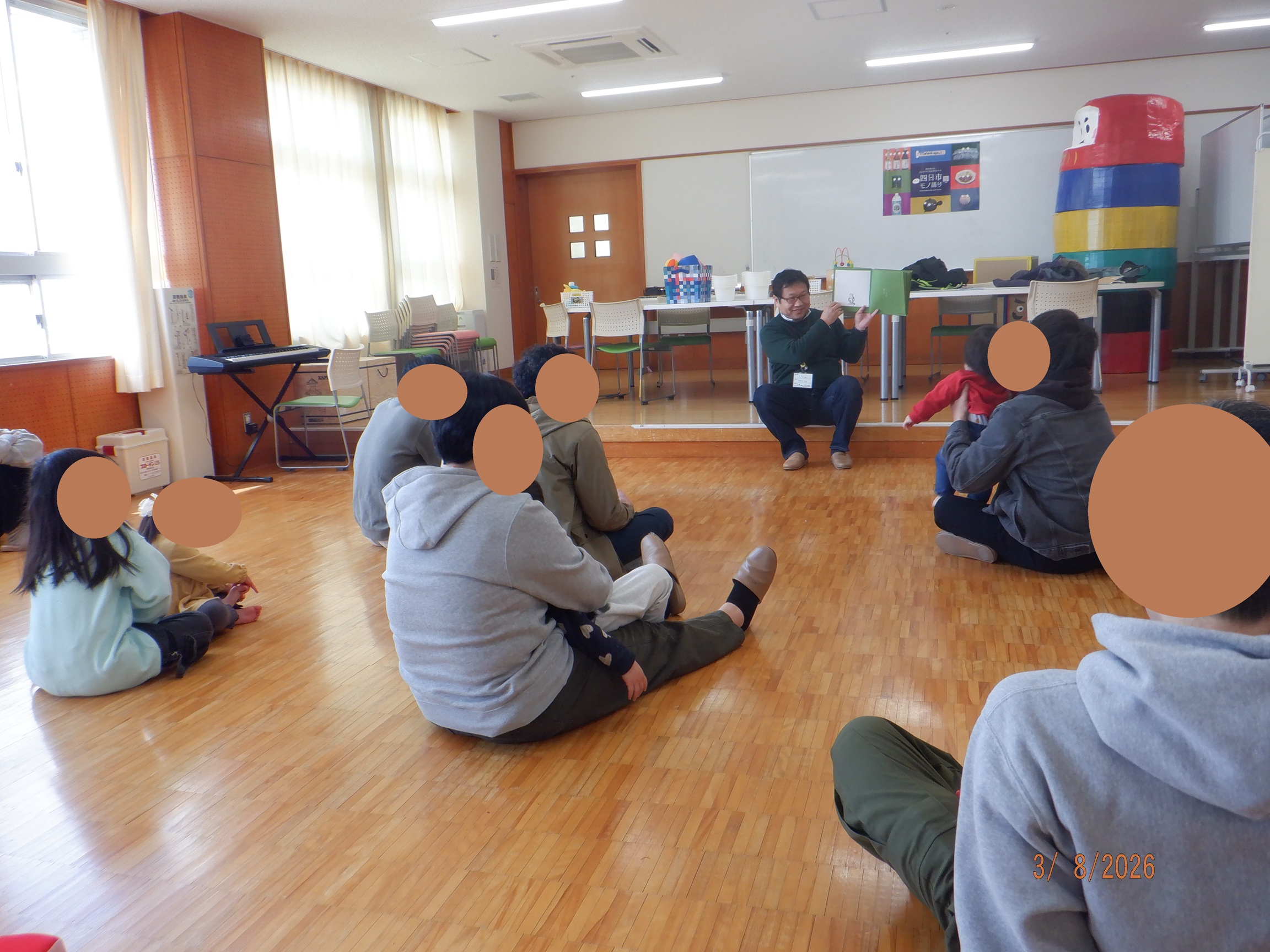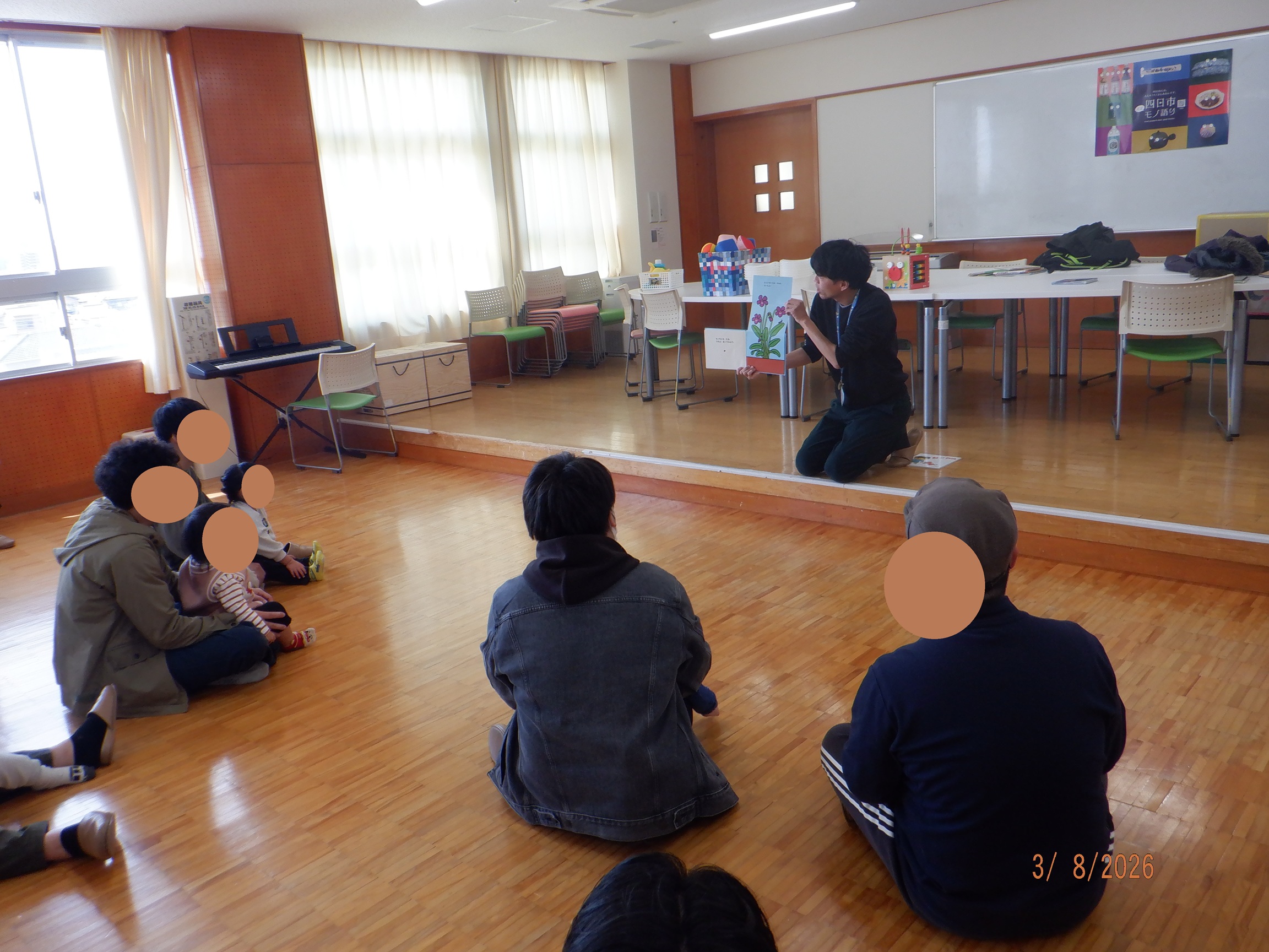 今月の絵本の読み聞かせは、よかパパ相談員さんによる「ねずみくんのチョッキ」と「はなのさくえほん」でした。