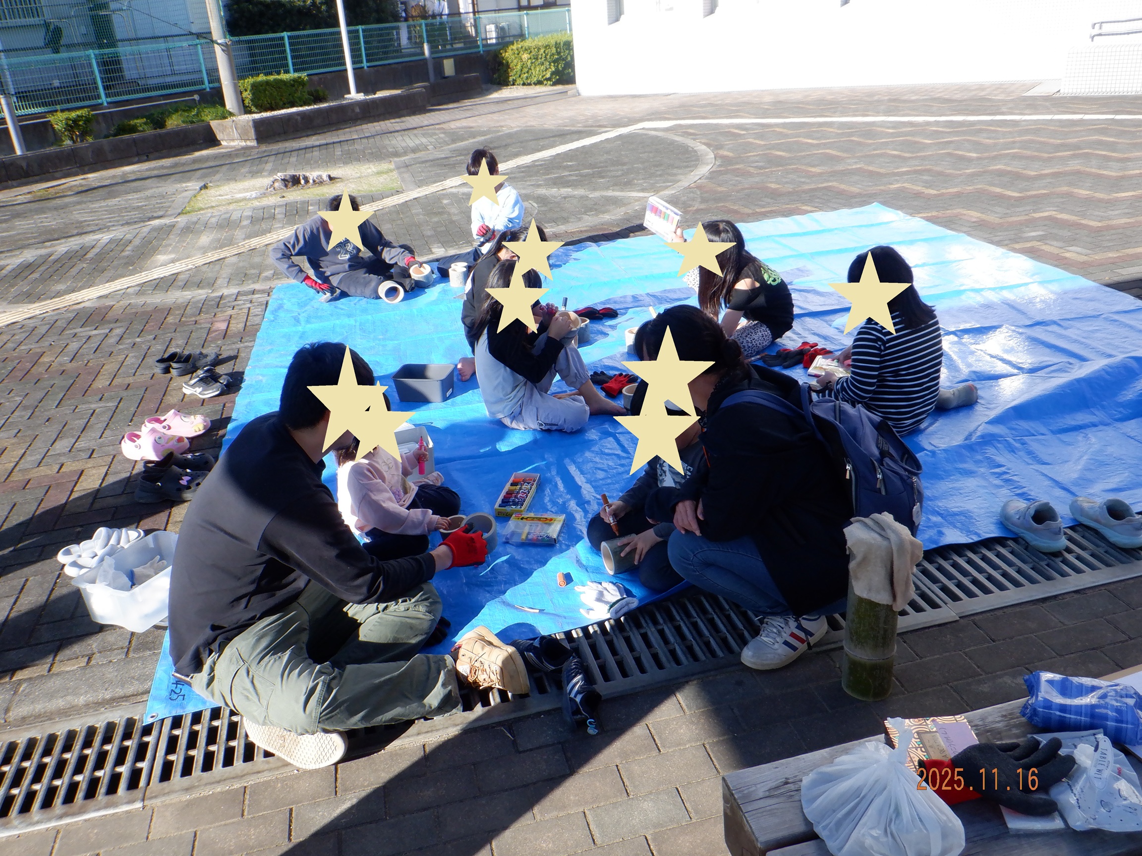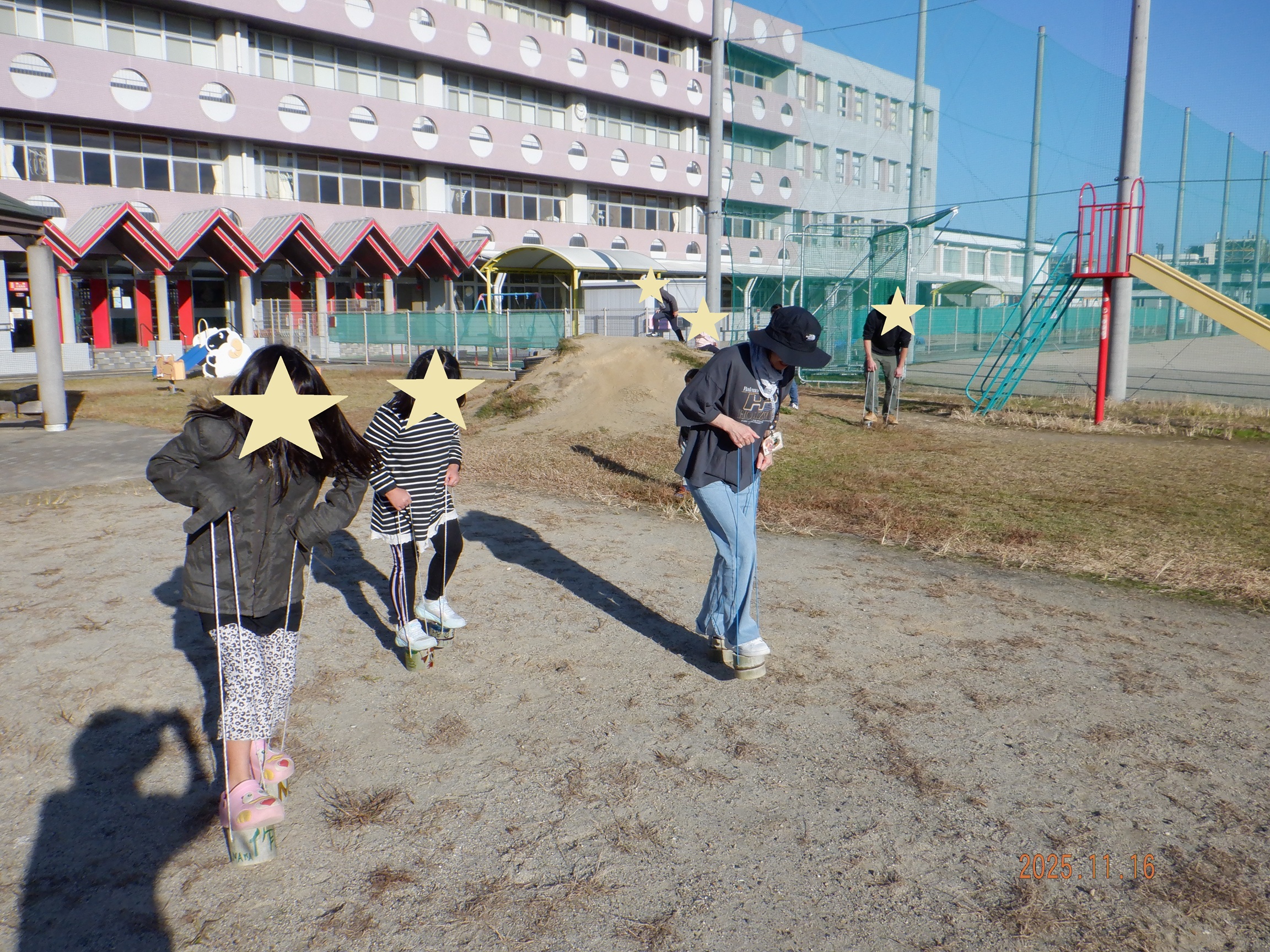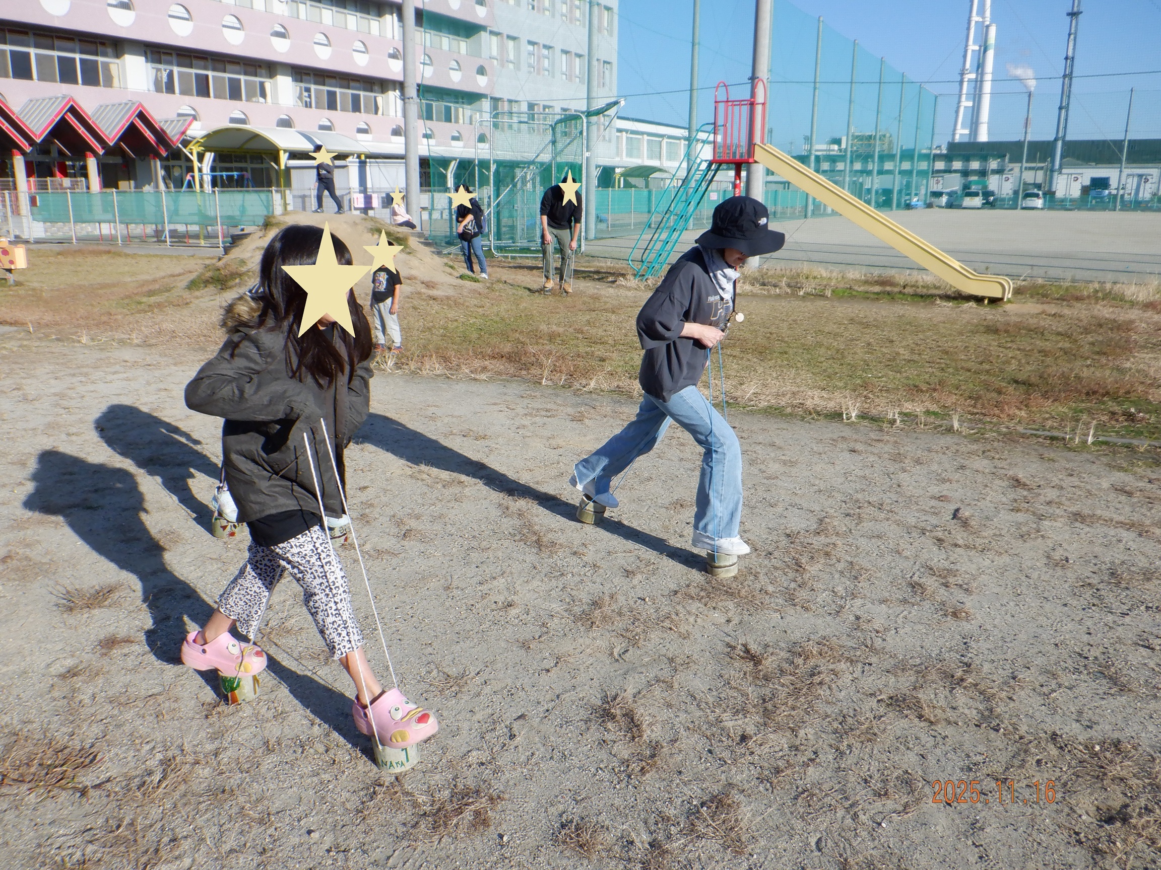 完成した後は練習して、みんなで竹ぽっくり競争。