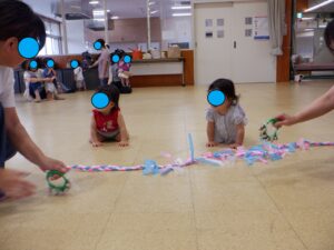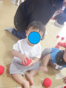 運動会の季節ですね。 プラザでも乳幼児親子の皆さんと かわいい運動会をしました。 写真は0歳児のりんごクラスです。 ハイハイレースでは大粒の涙を流して ゴールする子もいましたが 涙あり、笑いあり、拍手ありの 楽しい運動会でした。