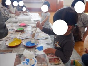 たんぽを使って、たまご型の画用紙にポンポンと、 色や模様をつけてあそびました。
