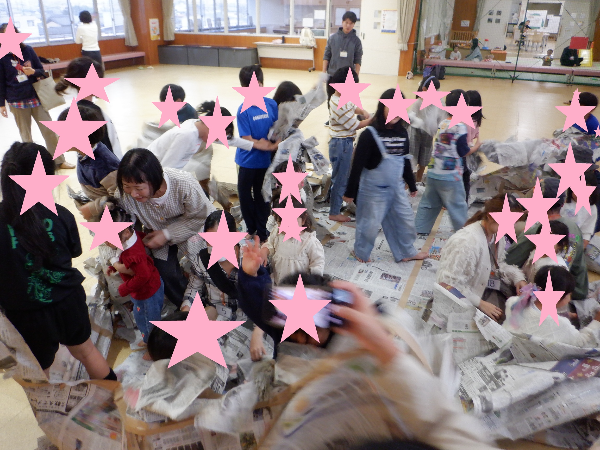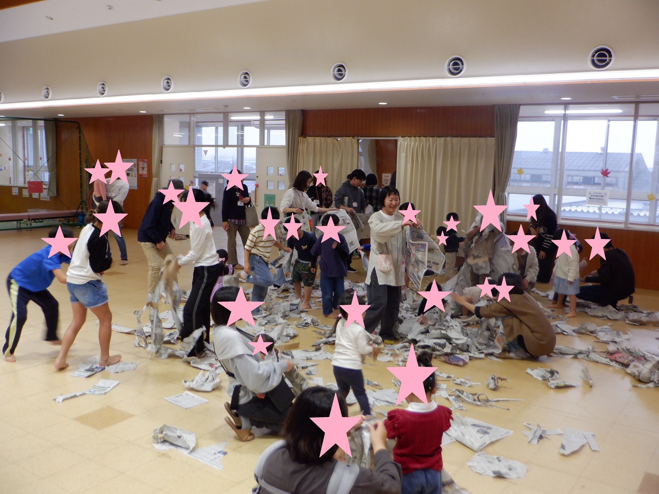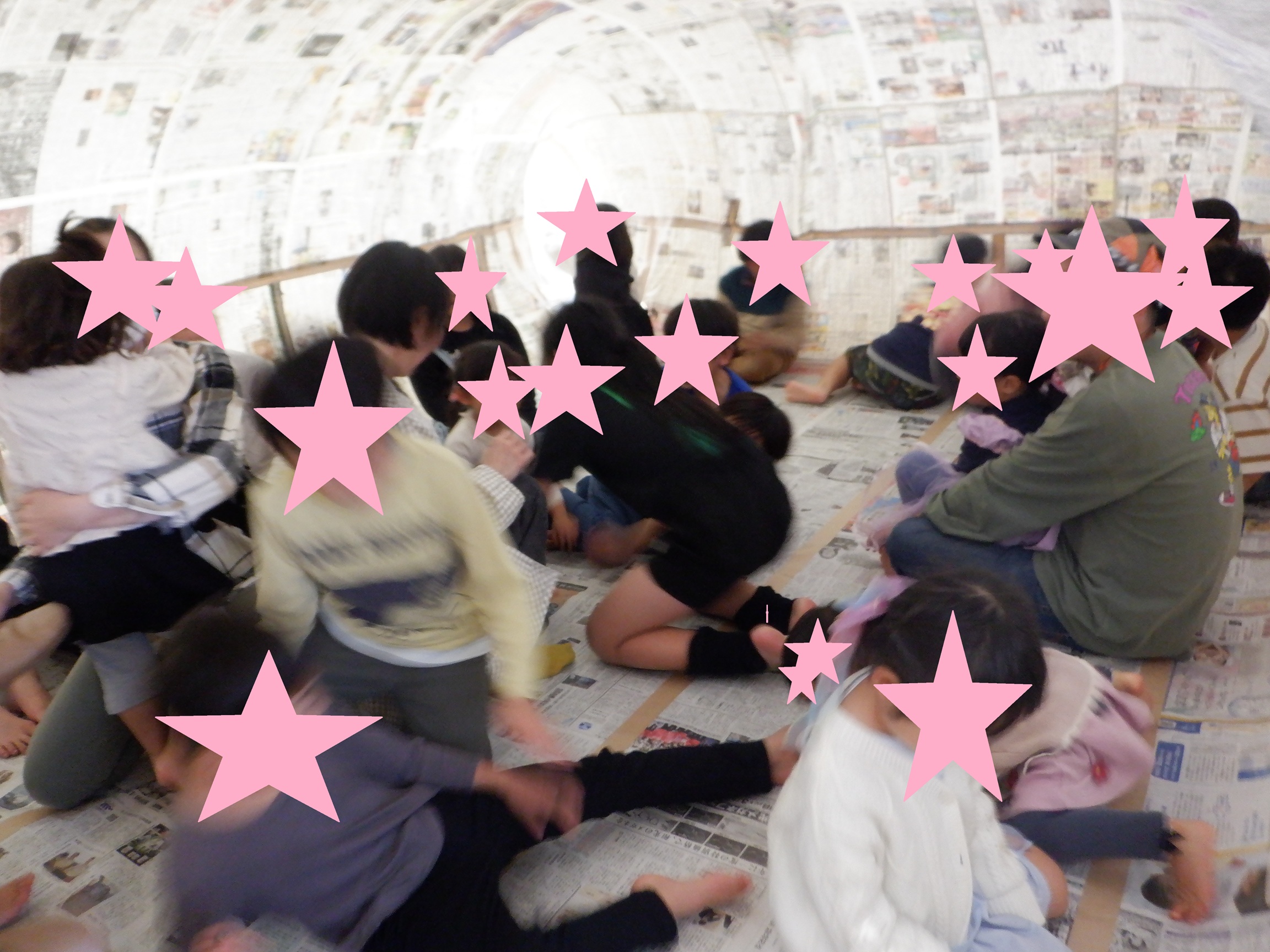 最初に大きな大きな新聞紙ドームの登場!みんなで新聞紙ドームの中に入って、最後は「バーン!」と破って出てきました。