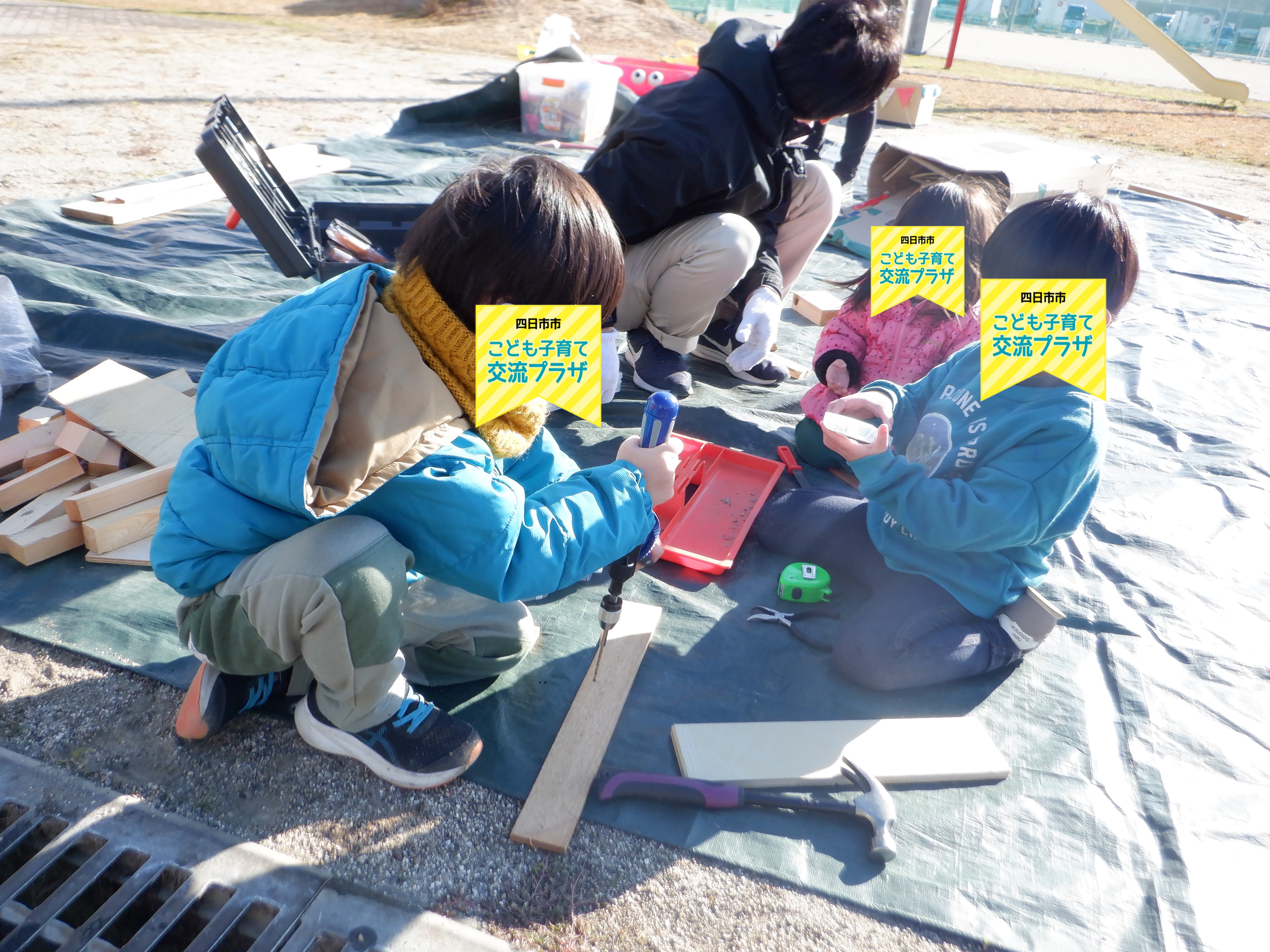 キリで穴を開けたり、釘を打ったり、鋸を引いたり…いろいろな音が響きます。 どうしたらできるかな?と試行錯誤する真剣な顔、やりきって嬉しそうな顔、みんないい顔してました! 寒くても天気のいい日には、外あそびもいいですね。 また来年もプレーパークで一緒に遊びましょう!