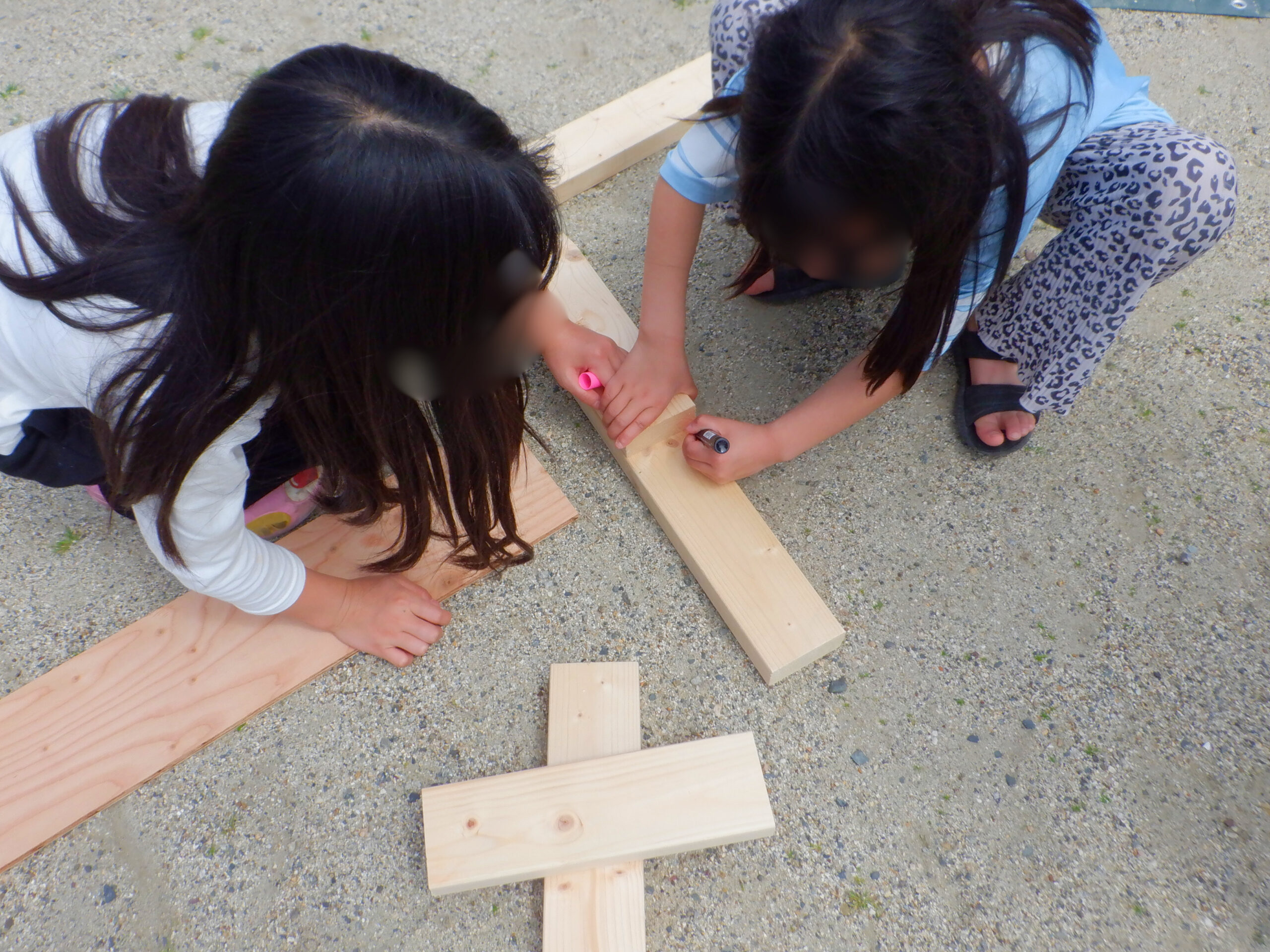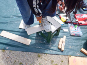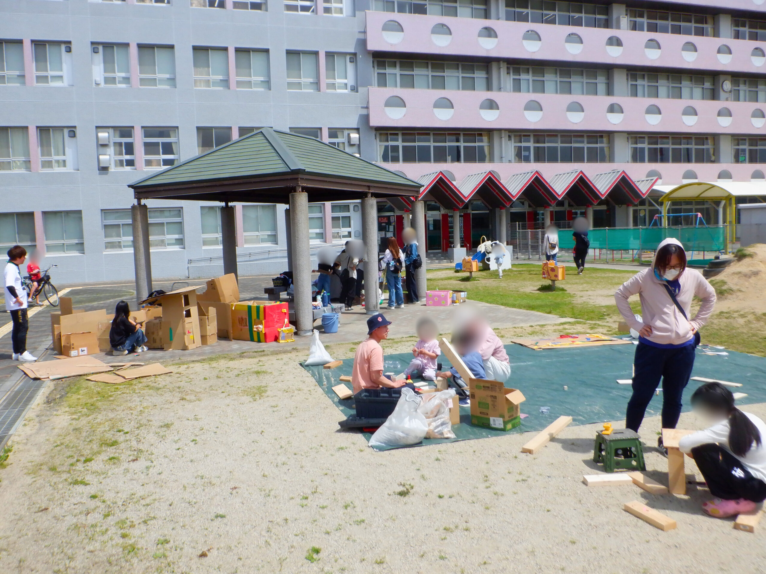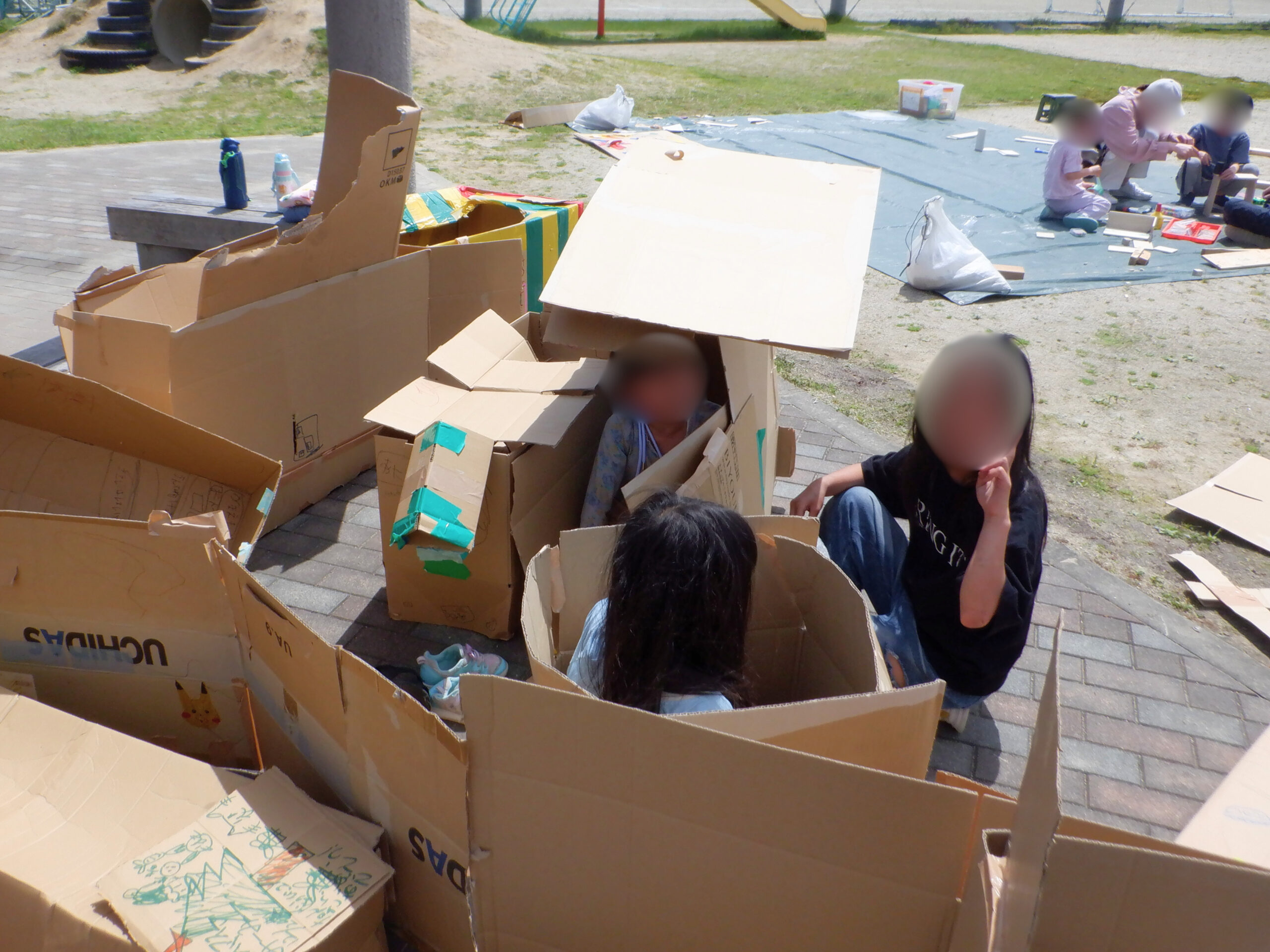 気持ちの良い晴れ模様の中、大人もこどもも一緒に、元気に外あそびを楽しみました。 段ボール、砂場、箱車などのあそびに加えて、今回は「木」をテーマに 普段よりもたくさんの木材に触れてもらいました。 初めてのノコギリやネジ、釘打ちに挑戦するこどもたちに、こどもたちの やりたいあそびを見守りながら、ときには保護者も一緒になって遊ぶ、楽しい時間でした。 こどもから大人まで、思い思いに過ごせるミニプレーパーク。 今年度も定期的に実施していく予定ですので、ぜひ一緒に遊びましょう!